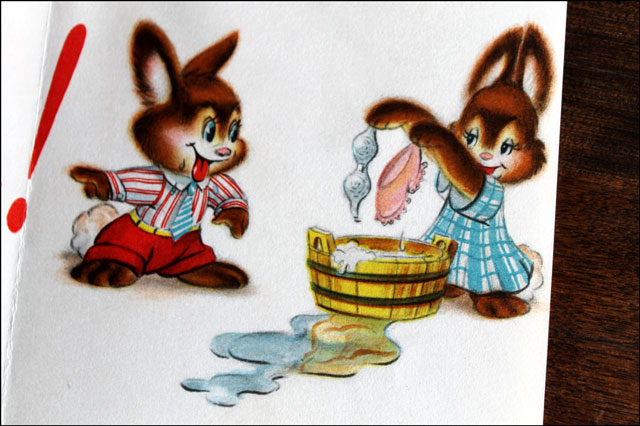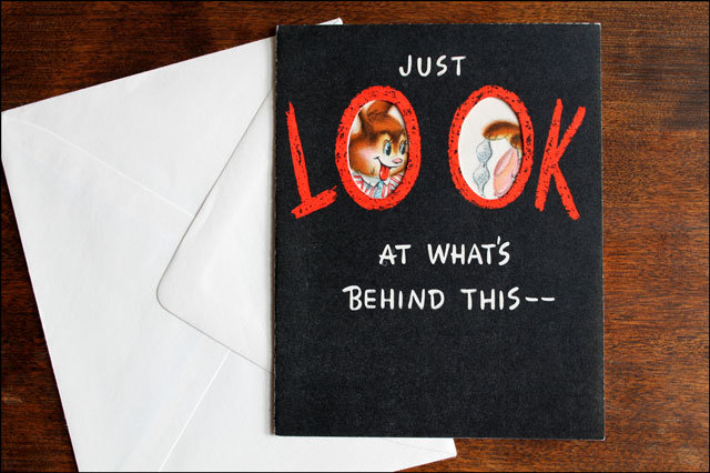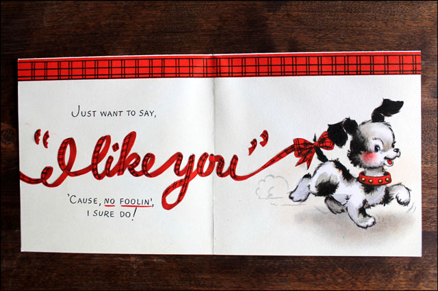 I would estimate they come from the early 50s, and they are both made by Coutts, that was a division of Hallmark Greeting Cards here in Canada. You’ve heard that saying by Valentine’s Day naysayers, that it is a Hallmark Holiday, in that Hallmark made it up to sell more cards? Well, that’s just not true in the case of V-day, since it dates back to well before Hallmark began trying to sell greeting cards to celebrate it. But here I think we might have a true-blue Hallmark Holiday … One that didn’t take off, that is. Because really, who sends April Fool’s cards?