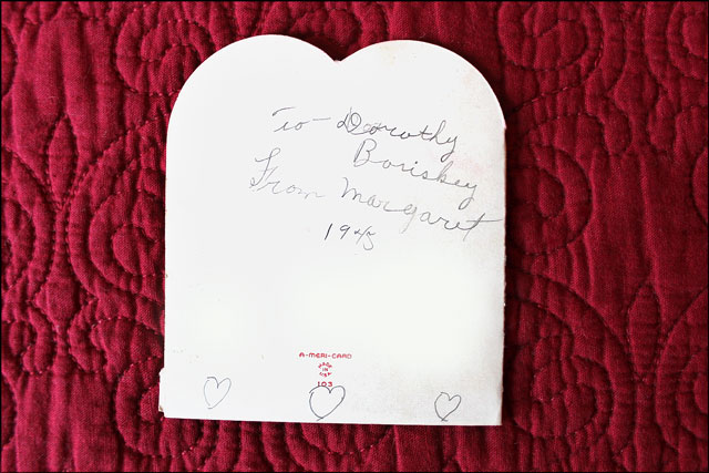 I thought about putting the details online and offering to give these Valentines back to the family, but aside from not wanting to invade the privacy of an elderly lady, further research indicated that it is highly likely that it was her family who relinquished the cards to be sold in the first place. The person who sold them lived a couple of miles up the road from Dorothy’s childhood home, in a small town there. I discovered that Dorothy’s brother, who had stayed in the family home all his life, had recently passed away, so I am guessing that these cards were found undisturbed where they’d been put back in 1945 by those who were clearing up the estate.