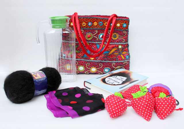 Nearby was a sealed plastic bag containing 5 adorable tote bags, that tuck into their own built-in strawberry case. I’ll use these at the grocery store, where we pay 5 cents extra for each plastic bags (which, incidentally, I think is a good policy). I’ve seen these at a luggage and handbag shop and almost bought one for $5. I got all these for $1, so I’m glad I waited. These have never been used before.