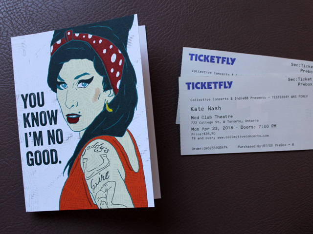 It was coincidental that Nick gave me the tickets within a greeting card that had the image of Amy Winehouse on it, since Kate and Amy are graduates of the same performing arts school, The BRIT located in the London Borough of Croydon, England. Amy was four years older, so they wouldn’t have crossed paths there, but it’s interesting that they had this in common and then tickets to Kate’s show were gifted inside an Amy card. (Adele also went to the same school, and they would have been there at the same time. So, maybe now I should be expecting some Adele tickets delivered inside a Kate card. I’ll let you know when that happens!)