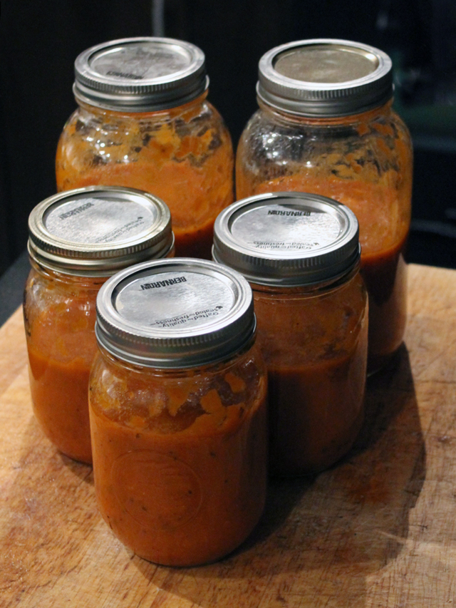 Nick spent the afternoon cooking up a large batch of tomato sauce from scratch, puréeing it in our new Vitamix that I got last month when Julie and I went on the Marilyn Denis show (written about here). We are quickly figuring out why people love the Vitamix Blenders so much … the food you puree in them really does come out more delicious. Something about using it intensifies the flavours of your ingredients, which is why they warn you about using less garlic and onions that you’d normally use. Nick’s sauce turned out very nicely. He put it in jars and froze them.