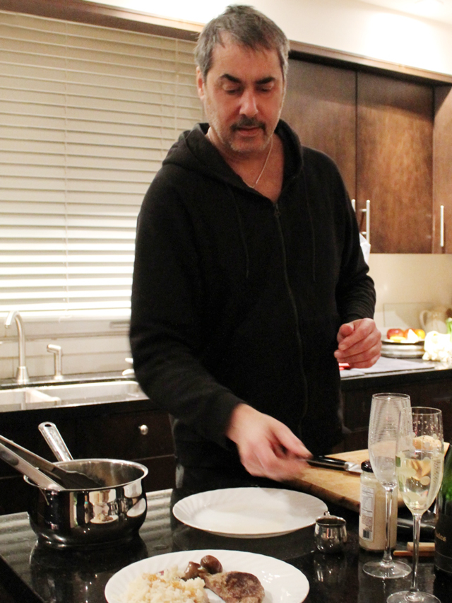 With that done, he got on to making our celebratory New Year’s Dinner, which was beef with a green peppercorn sauce, served with mushrooms, rice and peas.