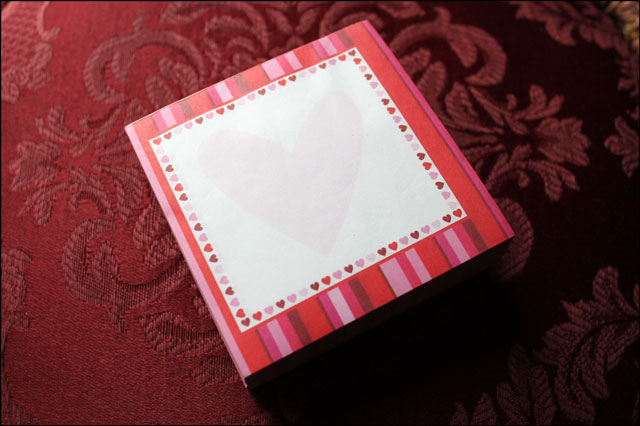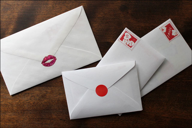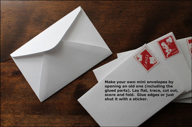 Since I would be mailing to households that included more than one child, I personalized the valentine for each of them by including a small hand-written note and putting them into a small envelope. I made the envelopes by completely opening up an old used one I had, and then tracing it onto a sheet of paper. I then cut them out, scored the fold lines and folded. I didn’t go so far as to glue them, rather using a sticker to seal them shut.