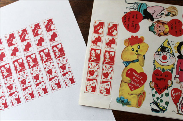 One part of the vintage valentines that I particularly find charming are the little stamps they used to provide, that children would cut out and glue to envelopes that they would be hand delivering. So I made my own reproduction of some by scanning some from an original vintage sheet and printing them up.
