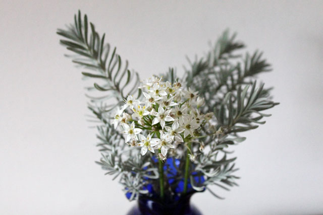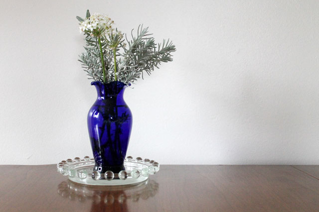 I set out a small vase (this blue thrifted one) into which I put some sprigs of lavender greens and a couple of wild onion flowers, from our garden (like these shown in the garden with a butterfly here. I’d never noticed before how much lavender greens which are evergreens, resemble pine branches when in a vase, so I plan to remember that when decorating at Christmas.