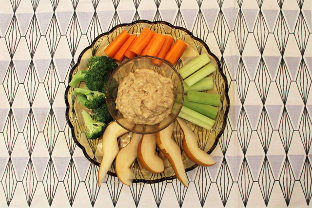 The appetizer was a Curried Bean Dip with vegetables and pieces of Bosc Pear for dippers. Our guests seemed to enjoy it, as did Nick and I when we snacked on it over the weekend, so I’ll write out the recipe and post it soon.