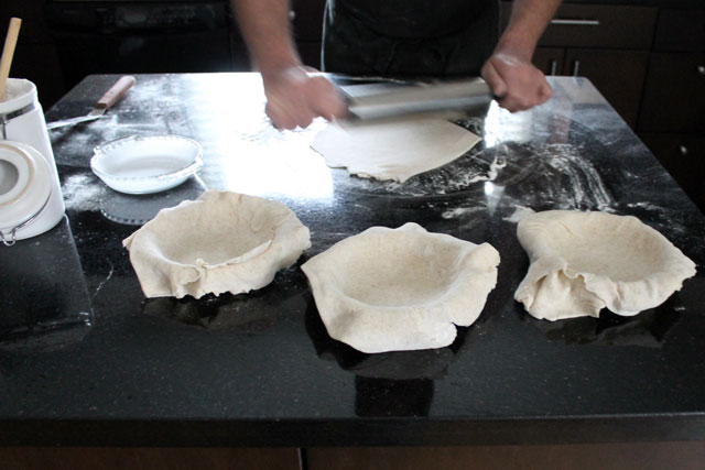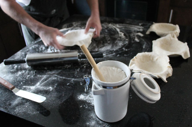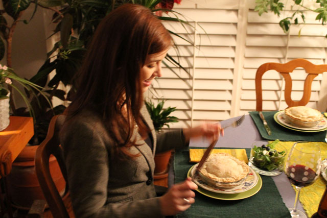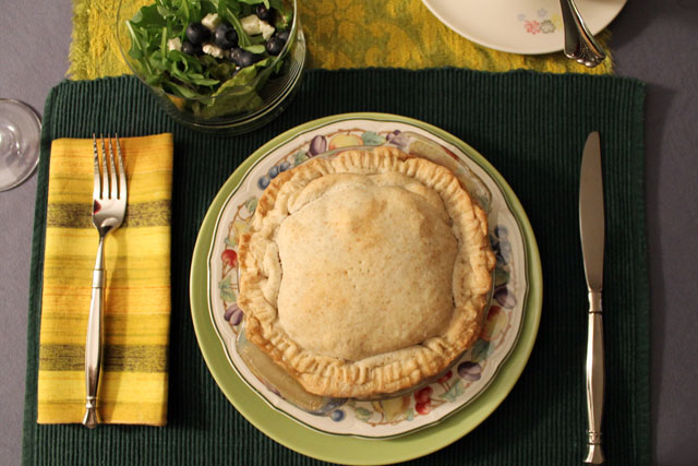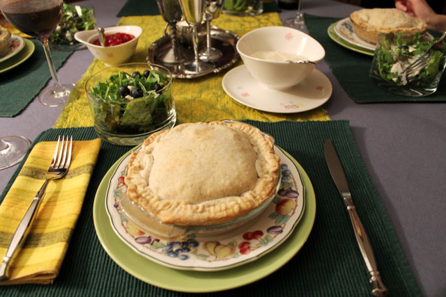 Nick made us individual Turkey Pot pies. Since it’s impossible to make these without using left-over turkey, I’ll admit to serving our new friends left-overs! The turkey was some stored in the freezer from our Canadian Thanksgiving dinner last month, described here. As a garnish we served the left-over homemade cranberry sauce that was also frozen, that I previously told you about here.