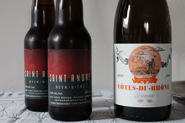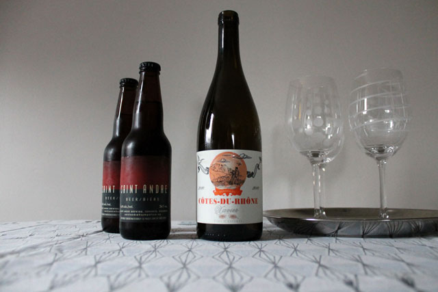 To drink we had Xavier Cote du Rhone wine, made in the Rhone Valley of France (which was delicious), and some locally micro brewed Saint Andre beer. It’s a lager brewed in the Vienna style with specialty malts brought in from Belgium, described as “Lager in the bohemian style”, which is right down our alley. Nick once met the gentleman who brews this beer himself.
