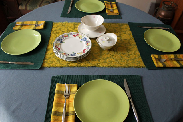 The linens were completed by a blue cotton tablecloth that I got from ebay a while ago, and some green place-mats that we’ve also had for some time.