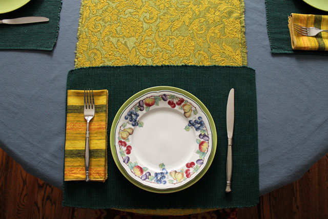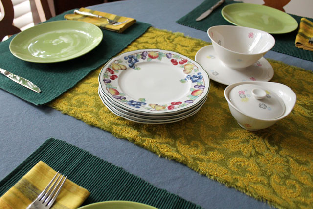 The table setting began with the gold runner. Well, it’s actually just a piece of nice fabric that I frayed at the ends and call a runner. I got it at a clothing exchange (That’s where a group of friends and friends of friends gets together at someone’s house, bringing along clothes that they are no longer wearing that they’d like to pass along to someone else. Whatever is left over is then donated. Someone had brought along some of her fabric stash that she wasn’t going to get around to using and I nabbed this piece of gold.)