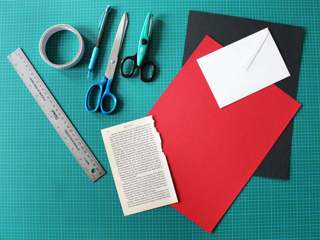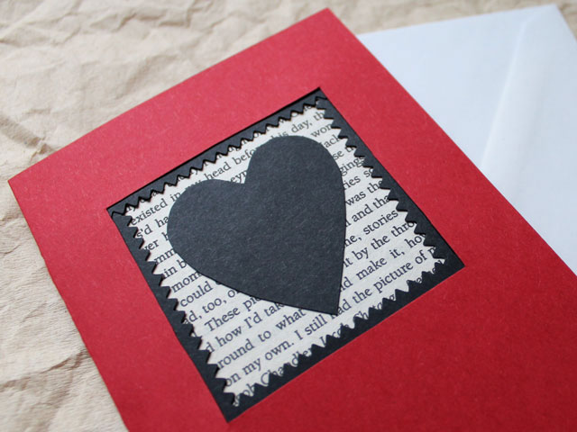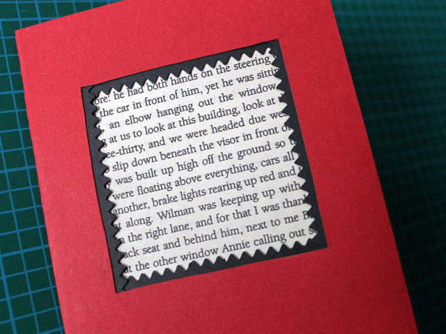 Here’s a card I made for each set of parents this year. I couldn’t help but go with the black and red colour combination that I love so much, adding a page from an old novel for visual texture.