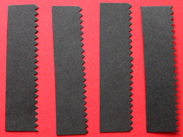 – To make the black ‘frame’ part, cut 4 strips from the black paper. Use your fancy-edged crafting scissors on one side of each, if you’ve got some. Attach each piece to the edge of the square by placing a small piece of two-sided tape on the edge of strip and then lowering the card onto the strip so that the edging shows through the square and it’s nice and even. Repeat with each strip, around the square. Don’t worry that the piece of tape is small and doesn’t stick the whole thing down … it’s really used more to tack things in place at this point, and more tape will be used later on.
