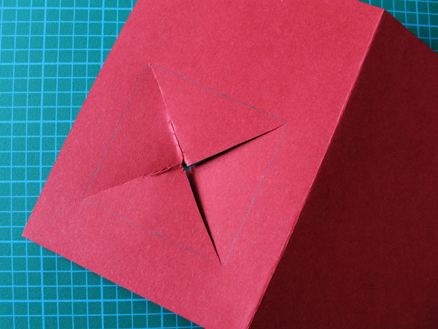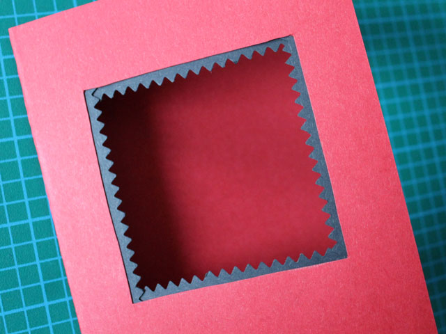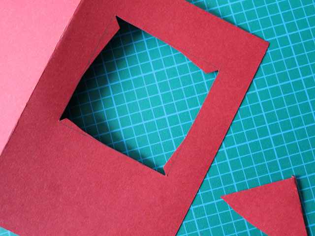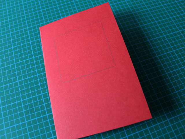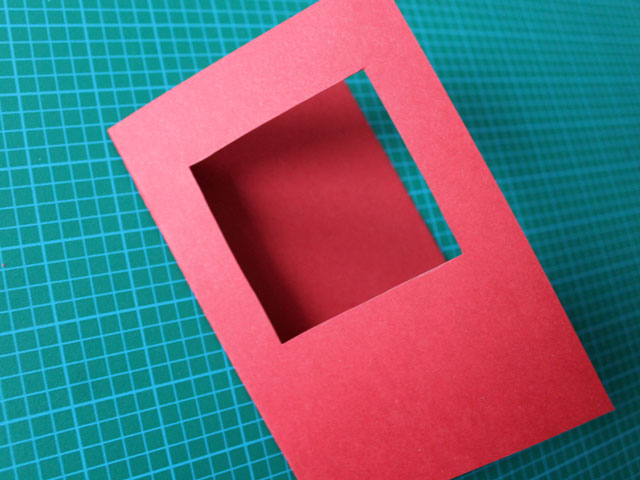 – Lightly draw a square on the front of the card. I made mine 2 1/2 inches square, centering it horizontally (with 3/4 of an inch on either side), and beginning 1 inch down from the top. Cut the square out. I find it easier to make a neat square by poking a hole in the centre to begin with, and then cutting diagonally to each corner. Then you cut the corners off to make the square (as shown in the pictures). Gently erase any pencil lines remaining.