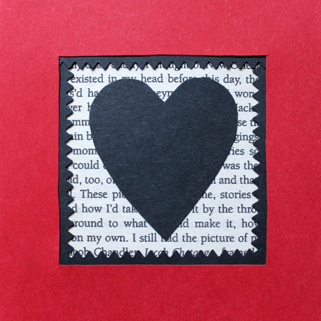 Look for a page that has a solid section of type that measures at least 2 3/4 inches square. Before choosing, take a look at what the type says because, no matter what the book, there might be something written there that could be offensive if taken out of context. In fact I had to pick a second page once I noticed the one I’d chosen said something not quite appropriate for our parents to have on the front of their valentine card!