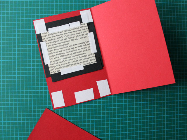 – To hide all that is going on on the back of the inside cover of your card, cut another piece from the red paper, that is slightly smaller than the card. Put a piece of two-sided tape on each corner of the inside cover of the card, remove all the tape backing (including those left when you attached the book page) and stick the red paper into place.