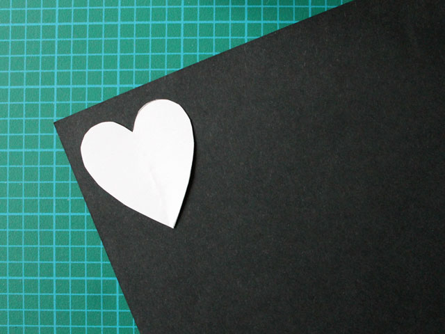 – If you’re like me, and tend to make hand-writing mistakes, you might not want to write your message directly into the card you’ve just spent time making. If so, cut yourself a rectangle of cream or white card-stock or paper, and write your message on it in ink. Once you’re happy with what you’ve written, attach it to the inside of your card with pieces of two-sided tape. Add another black heart to decorate it, if desired. Note: in the picture, that plain piece on the inside isn’t stuck down yet. I wrote on it first and then stuck it down.