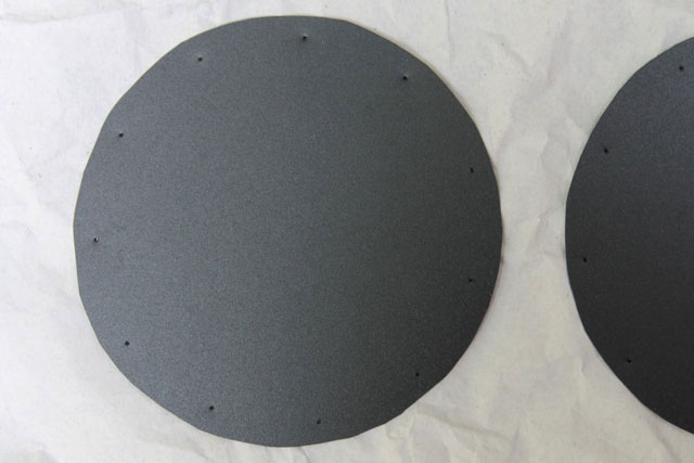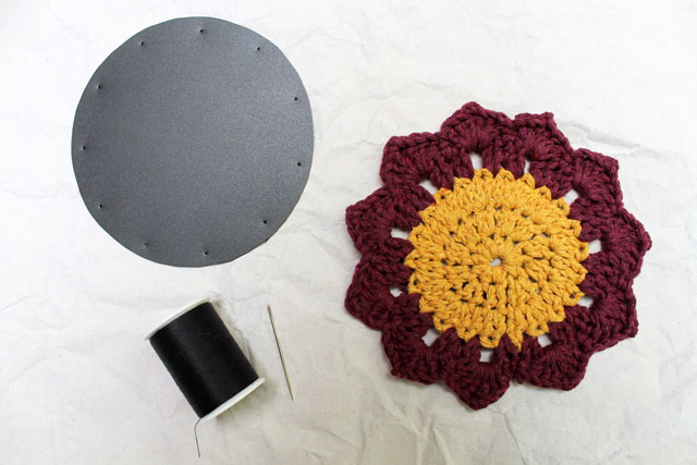 Then I measured to determine how large to make the plastic disks to stitch onto the backs. Note that the disks are smaller than the completed coasters, so the ‘petals’ hang over the edge and you can’t see the plastic from the right side, except a bit through the holes between the stitches. I used a bowl that was about the right size to make a round paper template. I also marked the places through which I would pass the needle and thread to stitch the plastic to the coasters.