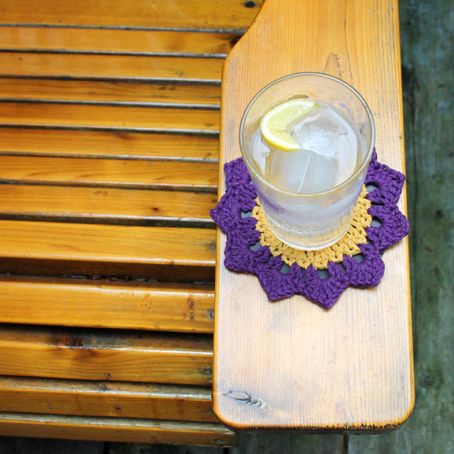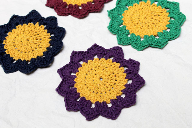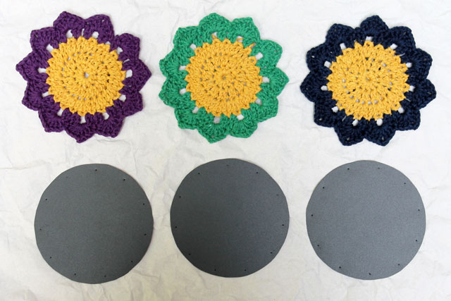 So, I set about figuring out a way to make some crocheted coasters that have a waterproof backing.