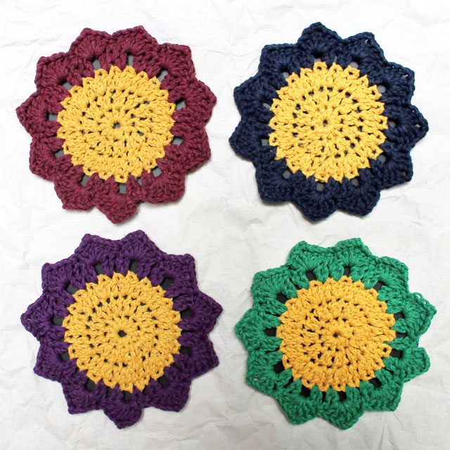 This method of making a waterproof crocheted piece could be used on any shape of coaster. Since I only used one side of the binder to make all four of these, I’m planning to use the other half to back a larger crocheted table-mat, that I’ll use under a plant.