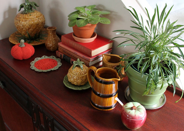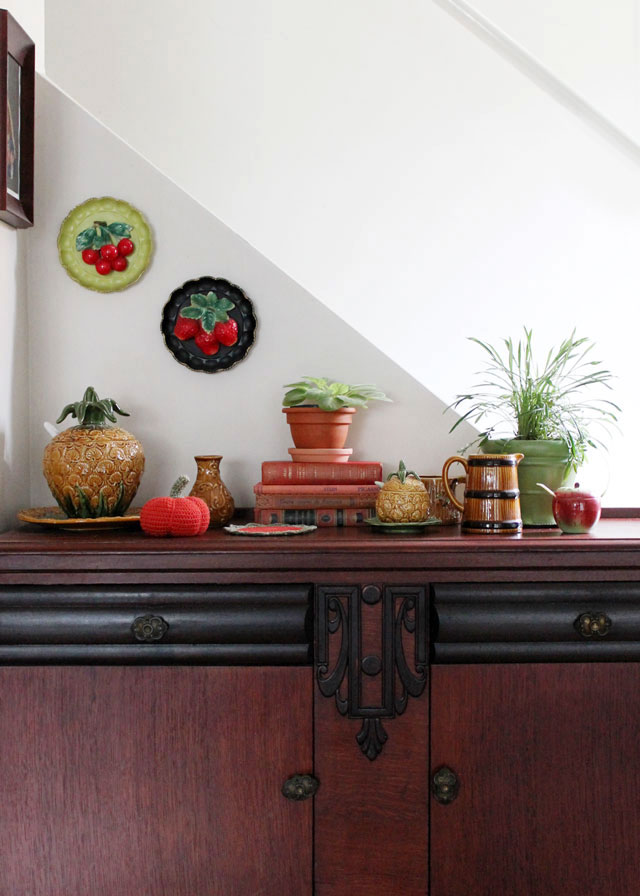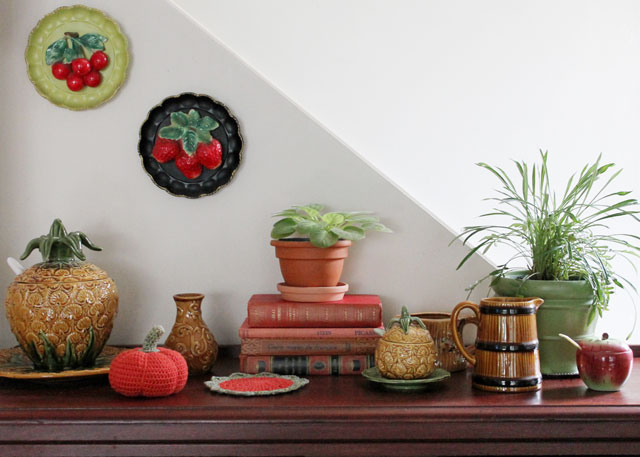 I displayed them a side-cabinet in our living room, among my collection of Majolica-Like Pottery pieces. Nick started this collection actually, after he brought home the big pineapple. He bought it at a garage sale held by our sweet elderly neighbour, who was moving. I actually thought it was fugly at the time and didn’t know where to put it, but it grew on me. Then when I found the other pieces on ebay and thrifting (see this post) I decided to embrace the big pineapple!