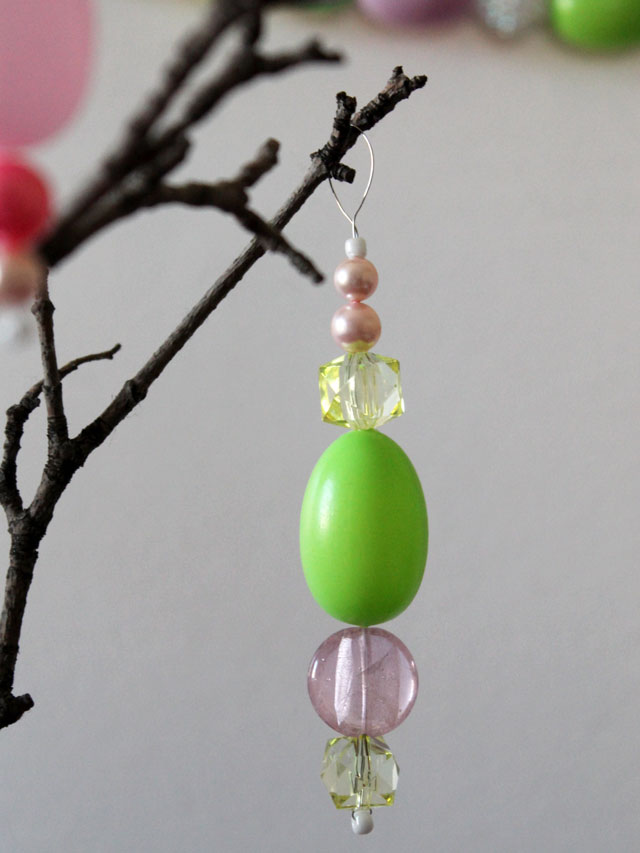 I ended up with some beads and plastic eggs left over after making the garlands, so I added some vintage beads from a broken necklace to make some hanging ornaments, as well.
