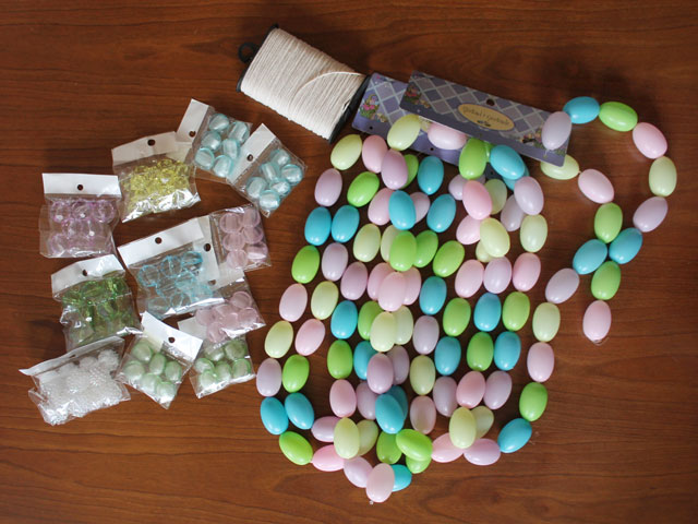 (3) Some embroidery thread long enough for the garland with an extra foot at each end to tie. Note that my picture of the supplies shows regular string, but that ended up being too thick to go through the beads when threaded on a needle, which you need to use in order to get the plastic eggs on, so I switched to embroidery floss, which worked perfectly.