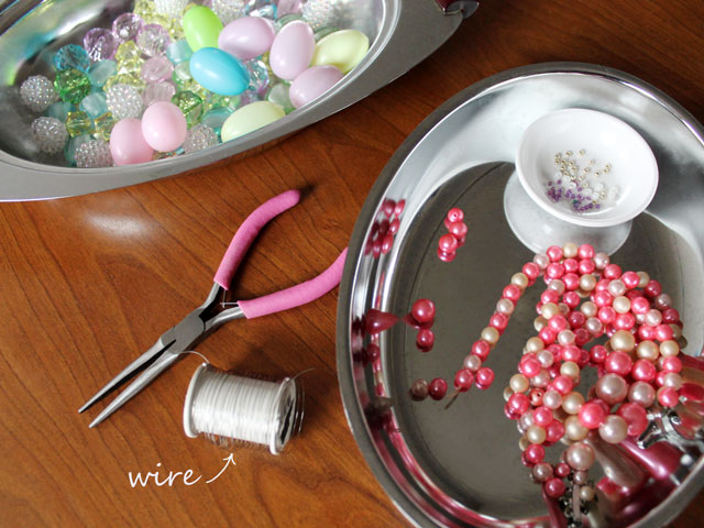 Cut pieces of wire about 7 1/2 inches long. Begin by attaching a seed bead, by threading it on and bending the wire up about 1 1/2 inches, and twisting to secure it. Then thread your beads and plastic eggs on from the top (the few on the bottom will end up covering the end of the wire that you bent up). To finish, make a loop by bending the wire down and passing it back down through the threaded beads (your pliers come in handy for that part), and give the loops a twist to secure them.