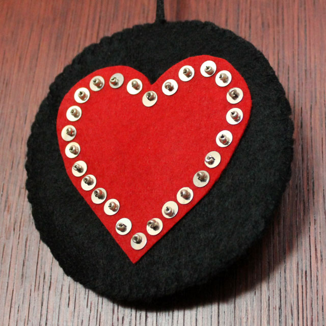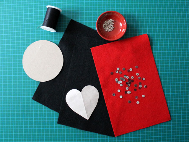 Supplies : Felt in two colours, some sequins and seed beads, some light cardboard, like that from a cereal box (you’ll be encasing it within two layers of felt, so the ornament will stay flat), a slightly larger circle to use as a pattern to trace onto your felt (I used a coaster), a heart-shaped pattern piece made from paper (if you need help making a perfect heart shape, there are some photos in this post that will help), a piece of ribbon or embroidery thread about 7 inches long (that will be the hanger), and a needle and thread to match your background felt colour.