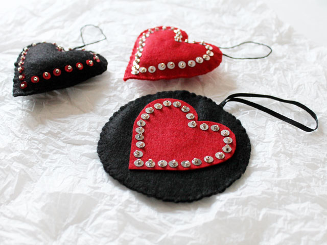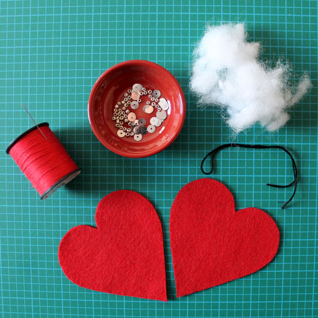 Attach the sequins and beads (as described above) to one heart, in the shape of a heart, about 1/2 of an inch from the edge of the felt.