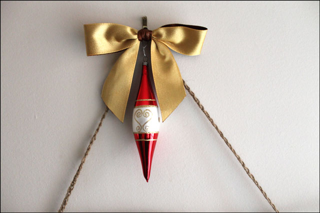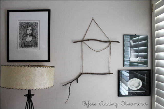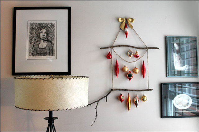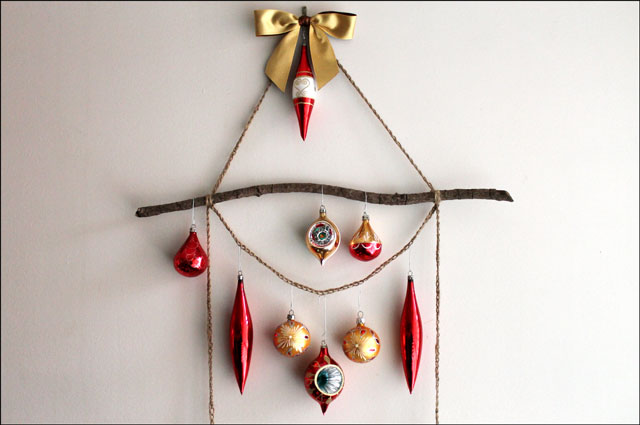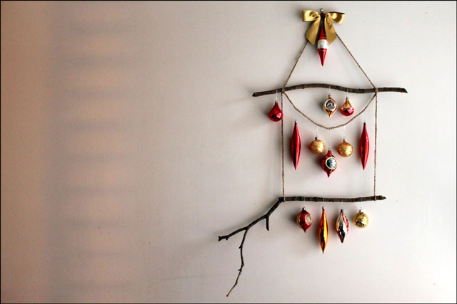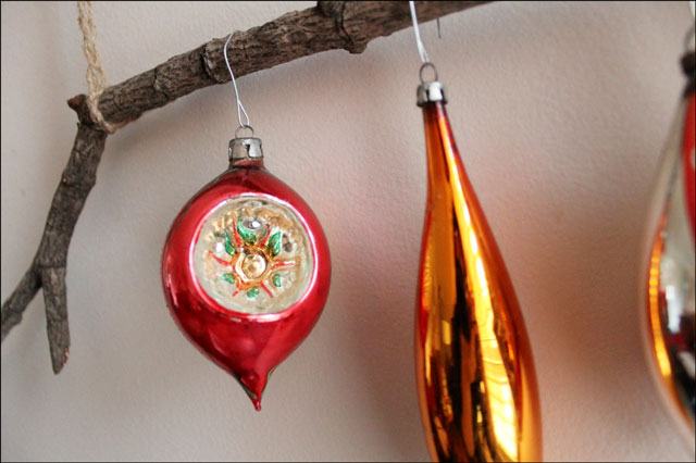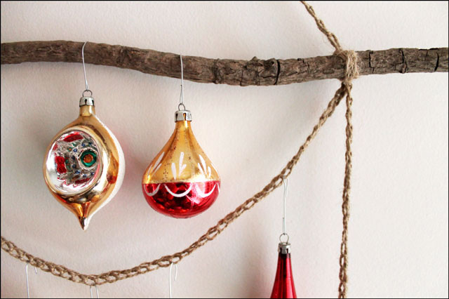 I have a soft spot for vintage Christmas ornaments, but we don’t always put up a tree, so I try to come up with interesting ways to display them. Here is a wall hanging I made, using branches and twine.
