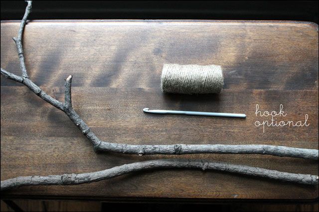 Supplies: Branches or dowels. Twine, yarn or thin ribbon. Crochet Hook (Optional). A bit of sticky tape.