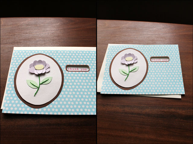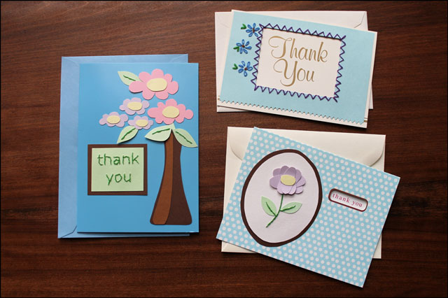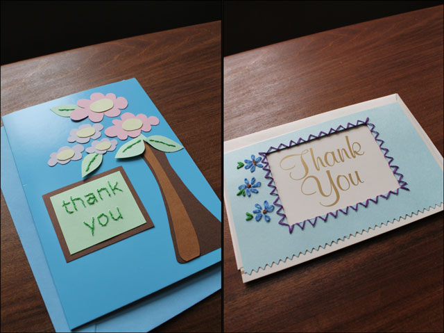 The third card was made using a pre-made vintage thank you card, a box of which I found at a thrift store. There’s a printing blotch on all of them but even without that I don’t think I would send out one of these cards without embellishment.