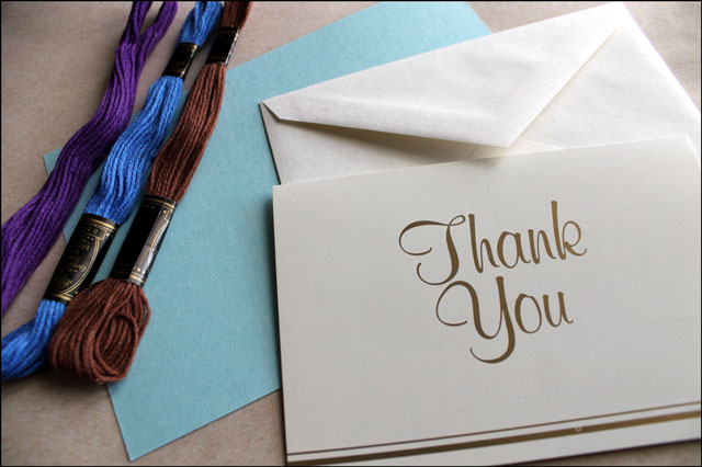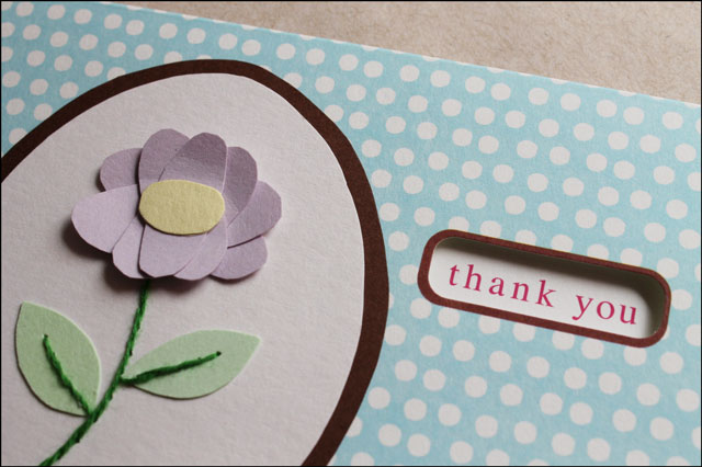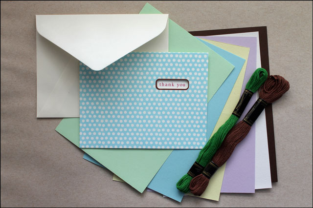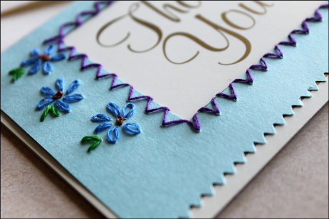 Back to the embroidered bookmark. Making this sure did pique my interest in stitching on paper and now I am hooked! For this Thank You Card project I wanted to combine the textures of thread and paper cutting, while making use of pre-made supplies. Basically I took commercially manufactured cards and dressed them up, adding handmade touches.