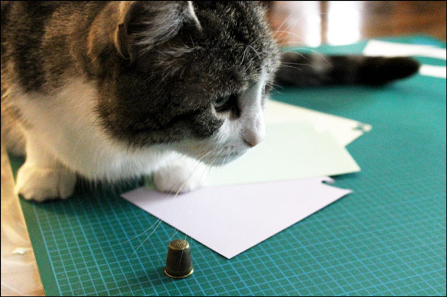 Oh yes, I almost forgot … No matter what, one can always use a little helping hand in life, right?! Or should I say in this case, ‘a helping paw’. Seconds after this shot was taken that thimble was batted halfway across the room! Oh yes, I was ever so thankful for the help.