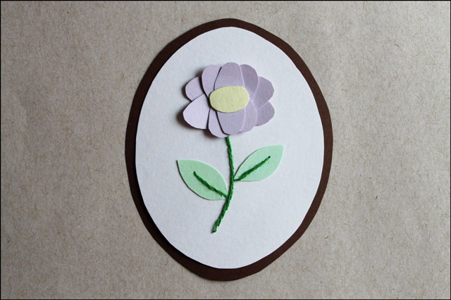 For the second one, the polka-dotted base card was pretty enough on it’s own, but I thought it needed something. So I made the flower medallion to decorate it, using cut paper and some stitching. I gave it a 3d effect by curling the petals a bit.