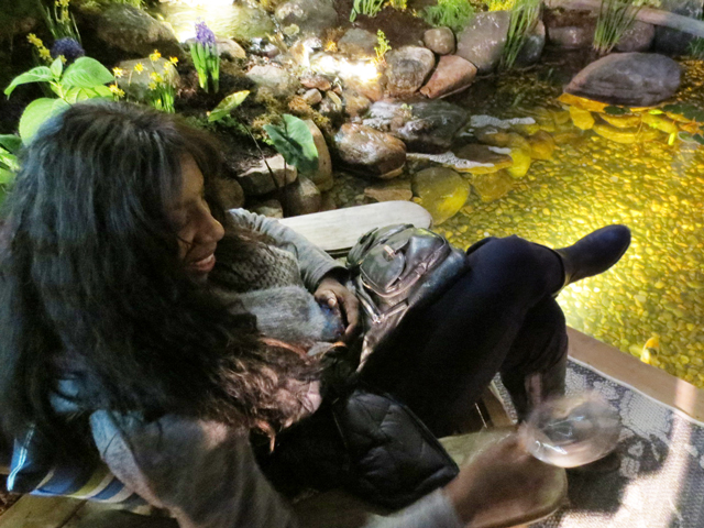 ↑ Leslie relaxing by the fish pond, in one of the rustic Muskoka chairs. ↑