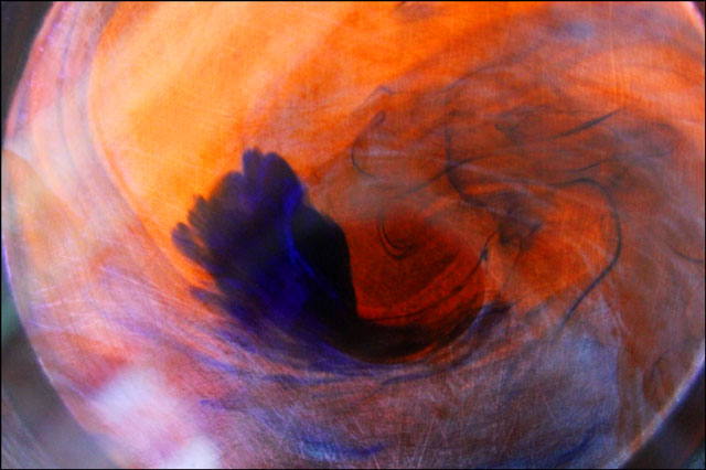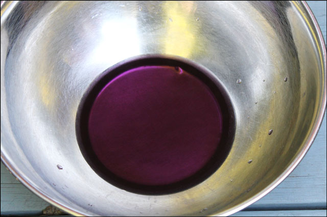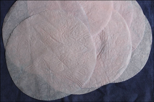 First I tinted my coffee filters – Using 3 drops of blue food colouring and 8 drops of red, in about 3/4 cup of water, I made a purple dye-bath into which I dunked the coffee filters. Then I laid them out flat on a piece of plastic to dry. They dried within an hour outdoors. To flatten them out I slipped the stack between the pages of a heavy book over-night, (although you could also iron them).