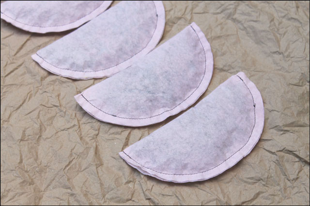 To make the bags, fold one coffee filter in half and sew about 3/4 of the way around the edge. Using a cone made from paper as a funnel, fill the bag with the scented lavender leaves. Sew them shut.