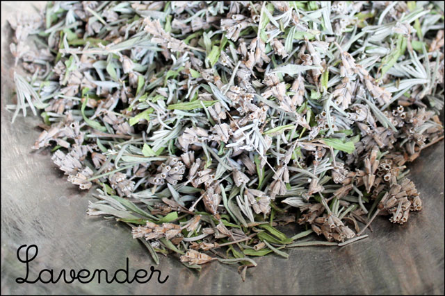 – Lavender leaves and buds, stripped of the stems and dried for a few days. (Note, I reserved some of the buds to use in the Bath Salts). To dry the leaves and buds, I just left them in a big bowl for a few days and occasionally tossed them with my hands. The leaves will still be soft and pliable rather than brittle after this amount of time. There’s no need to dry them out further than that.