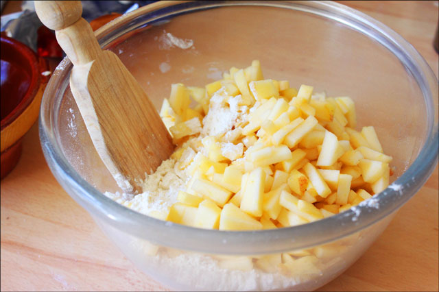 Dump the flour/apple mixture into the butter mixture along with the milk and stir everything together (not using the electric beater). Stir just until you don’t see any more flour. The muffins with remain flaky if you don’t stir too much which is what you want!