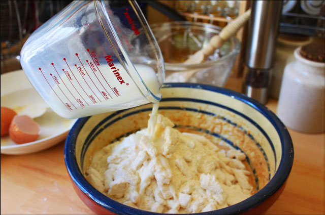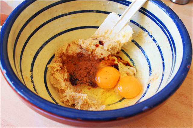 Add the eggs, vanilla and cinnamon to the sugar and butter and beat everything together thoroughly.