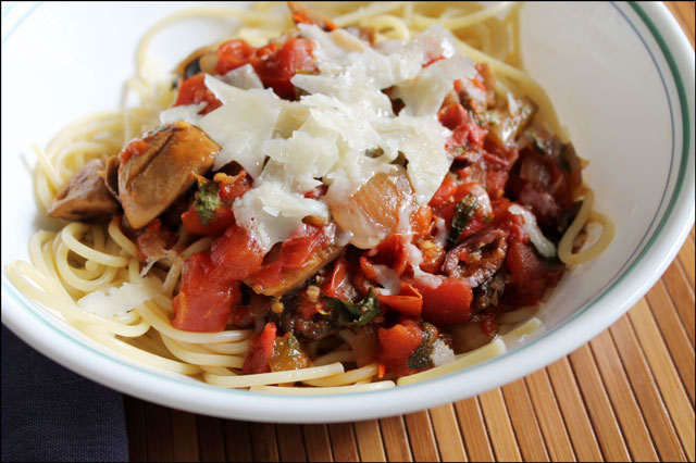 Serve sauce over cooked pasta, topped with some grated Parmesan cheese, and freshly ground black pepper and/or hot pepper flakes if you like some heat.