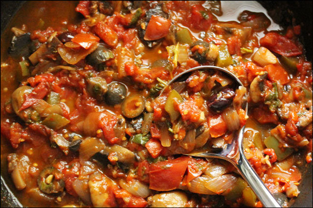 Heat olive oil in a deep frying pan and saute garlic and onions for about 2 minutes. Add mushrooms and bell pepper, and saute until softened. Add tomatoes and juices and dried herbs if using. Cook together until thickened. Add roasted pepper cubes, olives and salt. Stir until heated through, taste and adjust salt. (Note the peppers make the sauce taste a bit sweet, but that is good!) If using fresh herbs, mix them in at the very end.