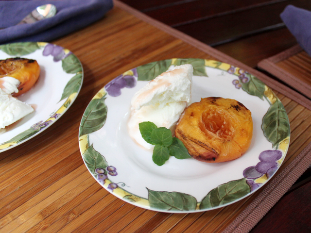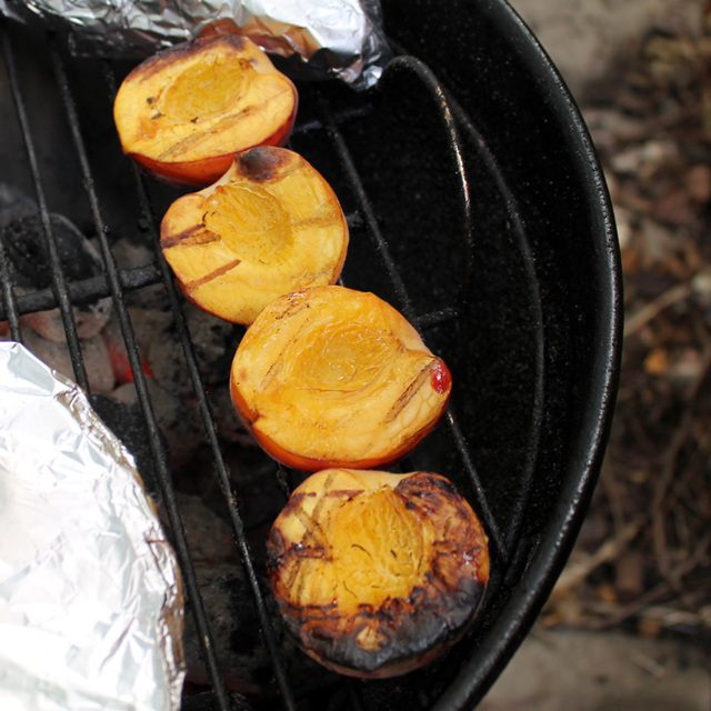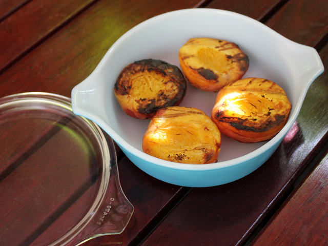 We also grilled some of the peaches for dessert. [Cut in half and remove pit. Grill with skin on until softened, turning every few minutes. Place in glass dish with a cover (which will cause the juices to come out). Add about 1 tsp rum, if desired. Remove skins and serve with vanilla ice-cream, with the juices drizzled over-top.]