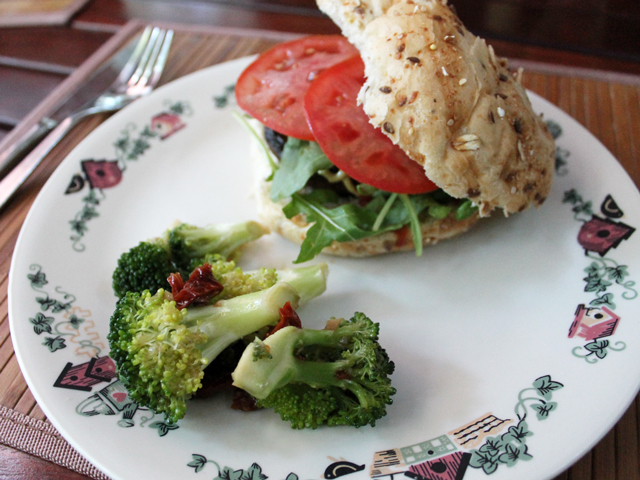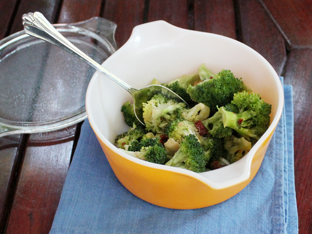 I made a marinated salad with some of the broccoli [Saute 1 minced clove of garlic in 2 tbsp olive oil. Add about 4 chopped sun-dried tomatoes, 1 tbsp red wine vinegar and about 1/4 tsp salt. Pour hot dressing over raw broccoli florets and allow to marinade for at least 1 hour. Add about 1/2 teaspoon fresh thyme leaves if you have some. Leftovers keep well in the fridge for several days.]
