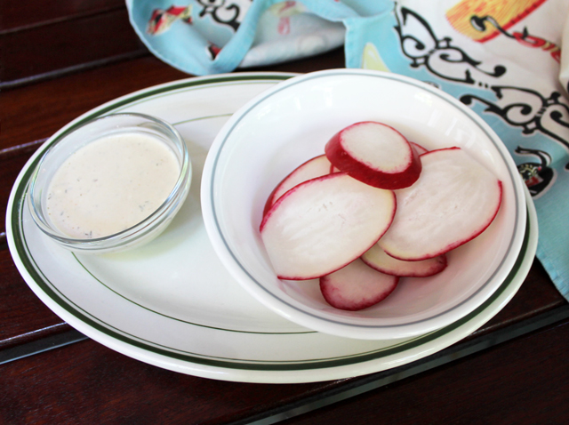 The radishes were sliced into tossed salads and also served as “chips” with a bit of homemade salad dressing as a dip. [Recipe for the dressing coming in a future post.]