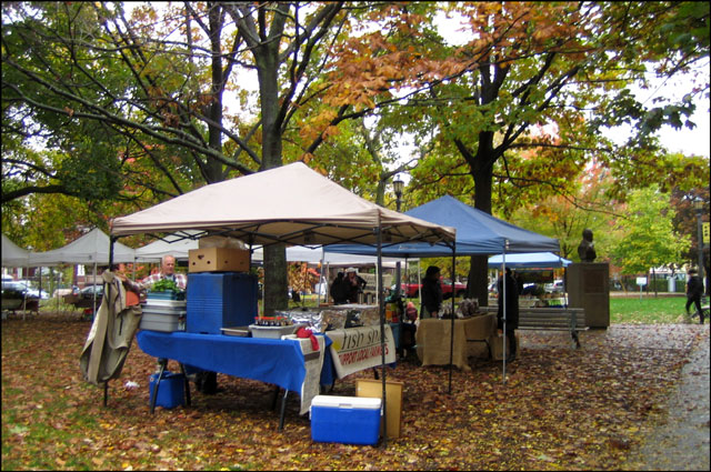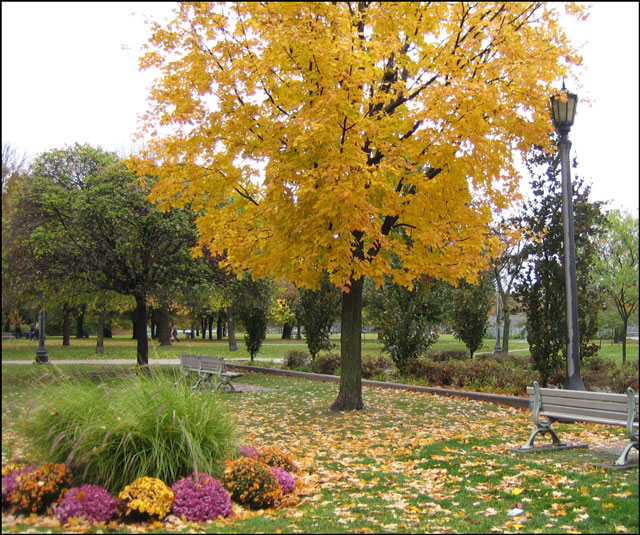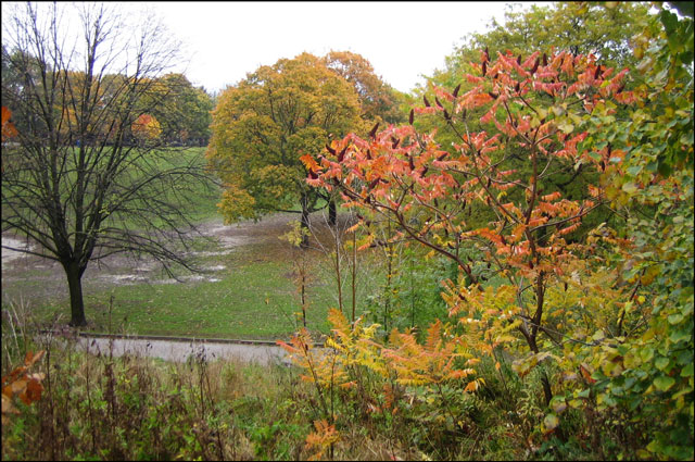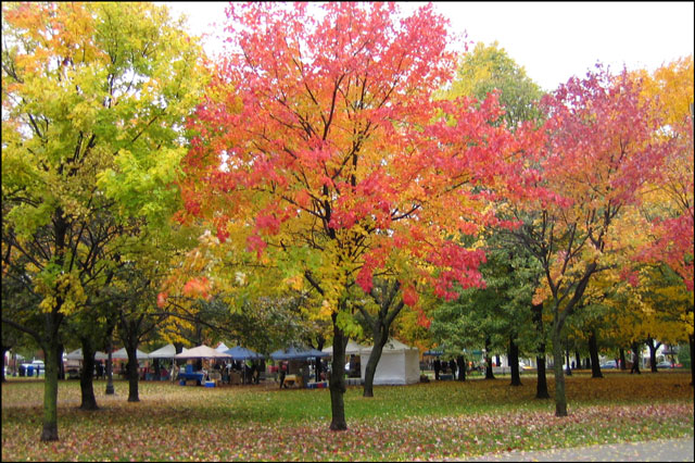 The park was nearly deserted when I arrived and made my way to the Market grounds, located at the north-western corner. And while it was as gloomy as could be, it was quite neat and different to be in the park in the rain. The brightness of the changing leaves stood out like they were lit from within. I saw funny little wet squirrels and a family of robins cheerfully bathing in a huge puddle.