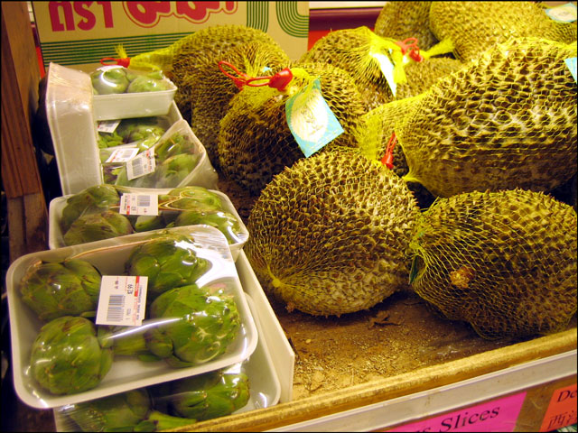 The big prickly looking fruits are called Soursops and are apparently very sweet. They are primarily used to make juices and desserts in the Philippines, Mexico and Central America.