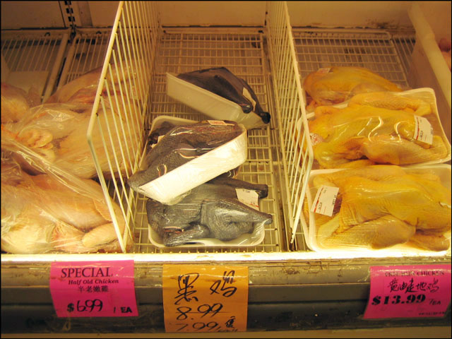 Those dark coloured chickens are a kind called Silkie chickens. In addition to their fluffy plumage, this breed of birds have dark-blue skin and flesh and have 5 toes instead of the usual 4 that chickens have!