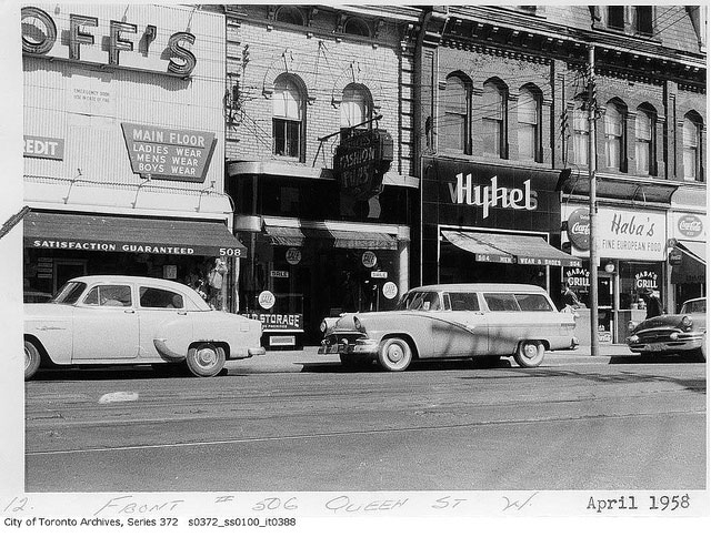 First there is this block of buildings (located at Queen West and Portland) that by chance includes one of our favourite restaurant in the area, The Epicure. These buildings would have been built around 1900. I love that by 1958, when the historic shot was taken, the landlords thought the old girls needed some sprucing up, with a fake front on part of the block, and a neat art deco awning on another.